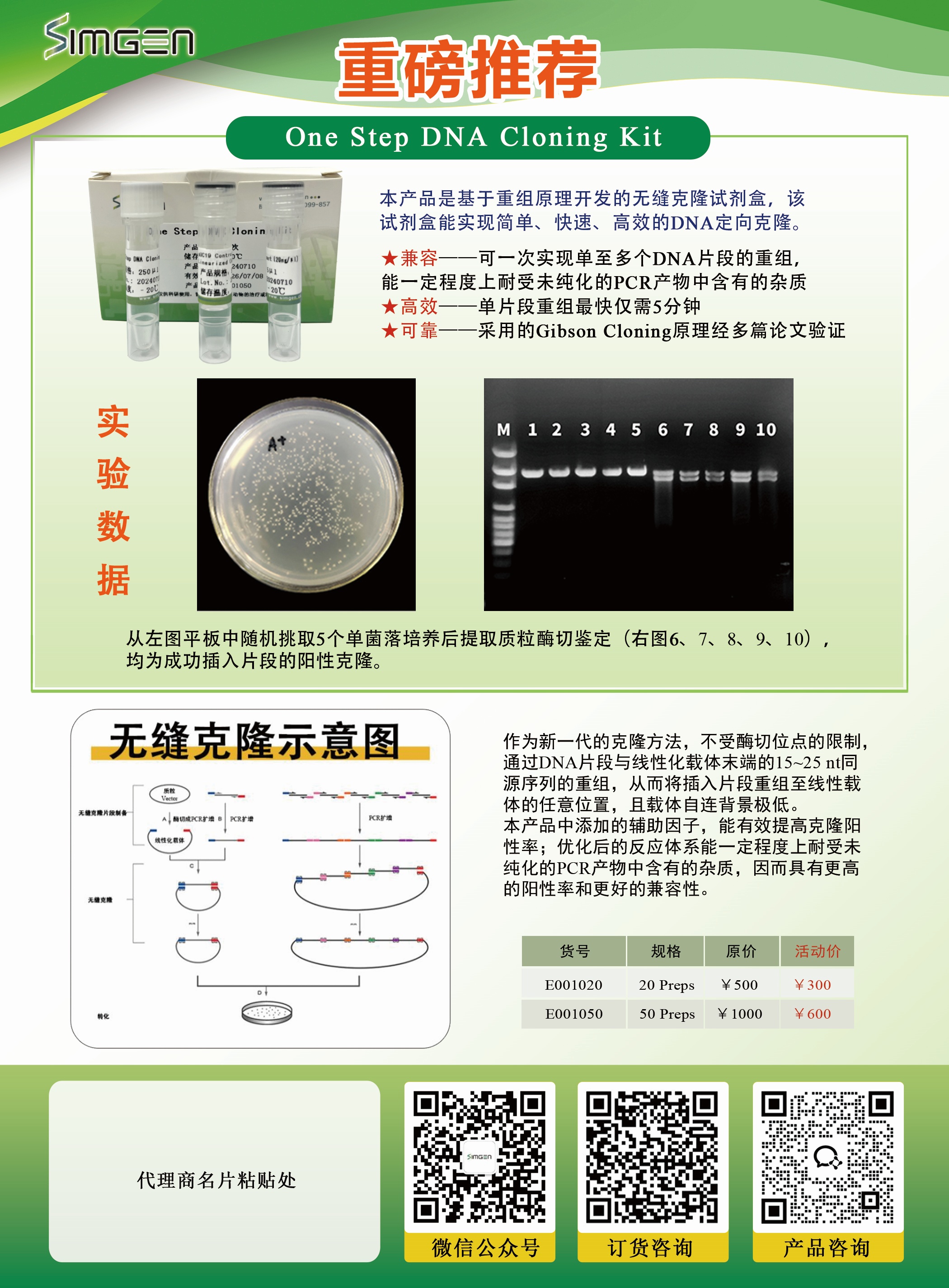 . 兼容—可一次实现单至多个DNA片段的重组,能一定程度上耐受未纯化的PCR产物中含有的杂质. 高效—单片段重组最快仅需5分钟. 可靠—采用的Gibson Cloning原理经多篇论文验证 查看产品
