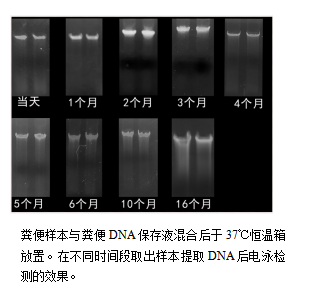 粪便样本中的DNA经粪便DNA保存液稳定后可在室温(15-25℃)保存6个月而免于降解,2-8℃或更低温度下可存放2年保持DNA不被降解。