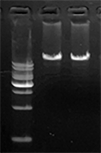 下图中:使用非柱式血液DNA提取试剂盒提取的人血样本扩增1.4 k片段 Marker:DL2000 ladder